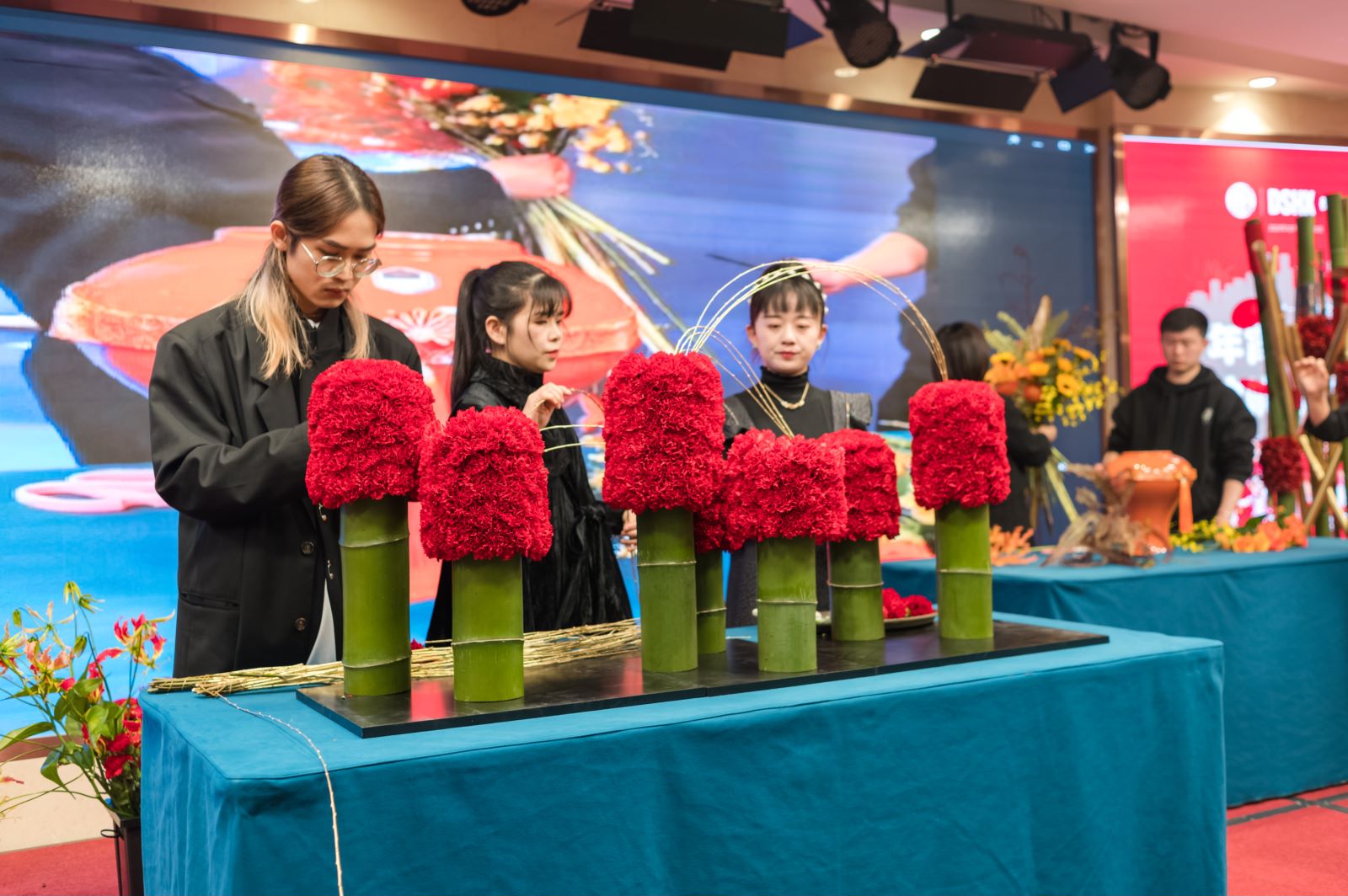 (新紫竹與花鄉(xiāng)的花藝師在為大家?guī)砟晗ù驑颖硌荩?/span>